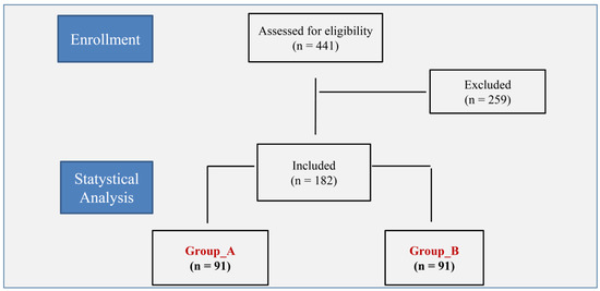 In this study, the allocation of patients to one group or another took place over two different time periods. From August 2020 to December 2021, all the patients matching our inclusion criteria received the “experimental protocol” (n = 91; Group_A). These patients were retrospectively matched in a 1 to 1 ratio with consecutive patients treated with rFSH from July 2020 backwards (up to January 2019; n = 91; Group_B).