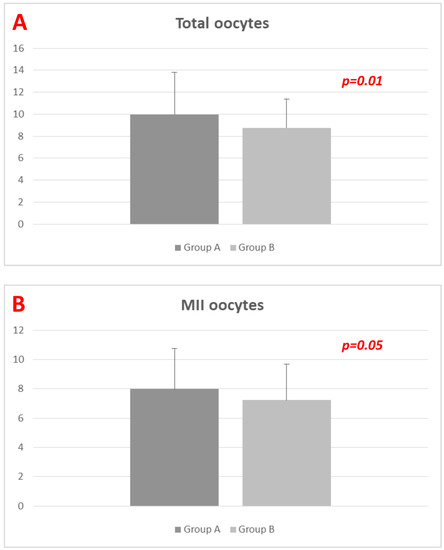 (A,B). Number of retrieved total oocytes (A) and MII oocytes (B) among groups (data expressed as mean ± standard deviation). p-values obtained by using Student’s t-test.