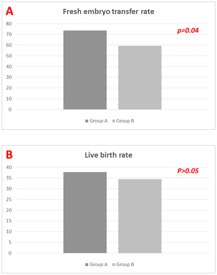 (A,B). Fresh embryo transfer rate (A) and Live birth rate (B) among groups (data expressed as percentages). p-values obtained by using Fisher’s t-test.