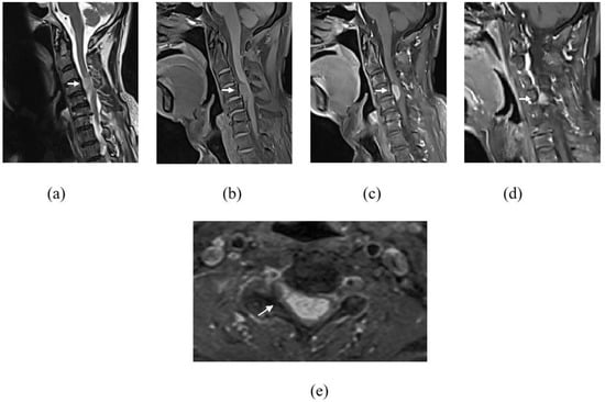 Images of cervical spine showing an intradural extramedullary lesion (white arrow) at the level of C4–C5. It demonstrates hyperintense signal on T2WI (a), intermediate signal on T1WI (b) and avid enhancement on gadolinum-T1FS sequence (c,e). This lesion causes spinal cord compression at this level with associated spinal cord T2WI hyperintense signal indicating of cord oedema (a). Right parasagittal image (d) showed extension into the right C4 neural foramina (e).