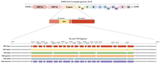 Genomic organization of SARS-CoV-2. The RBD region is located inside the S1 subunit from the S gene. The 75L/77R fragment comprises all mutations of concern from the VOCs along the RBD region. The wild type sequence refers to the SARS-CoV-2 reference sequence NC_045512.2.