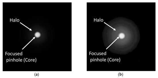 In brief, the image in a given focal plane consists of the core sharp image of the pinhole surrounded by a blurred and faint halo-shaped background (Figure 2a). The halo is clearly visible when a proper gamma correction is applied to the image (Figure 2b). The practical implementation of the EE metric versus the theoretical LIB requires the ideal point source to be replaced by a pinhole of a certain size, which was described and justified in a former work [51]. To compute the EE, an edge detection algorithm (Canny edge detector implemented in MATLAB MathWorks) was firstly applied to segment the central core from the image of the pinhole. Since the gray level of a pixel was proportional to the energy impinging on that pixel, we computed the energy of the light reaching the core (Ecore) by integrating the gray level of the pixels within the region. The energy of the image as a whole (Etotal) was likewise calculated from the pixels of the entire image. The EE metric was then estimated from the experimental ratio Ecore/Etotal [14,25]. The uncertainty in the computed values of the energy was basically due to the precision in the determination of the size of the core. Assuming an uncertainty of ±1 pixel in the diameter of this region of interest, the highest relative error corresponded to the lens focus with the lowest EE and smallest IOL-pupil (3.0 mm), which proved to be lower than 8% for the three IOLs.