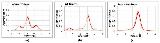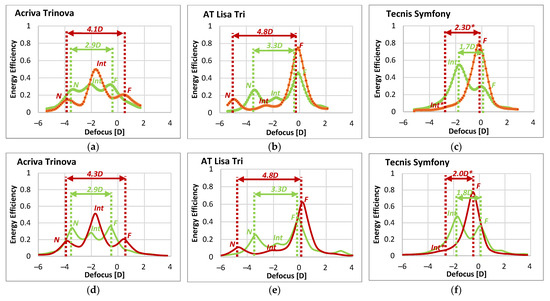 In the case of AT Lisa Tri IOL (Figure 3b,e), the far focus of the lens benefits considerably from NIR illumination, while the near and, more significantly, the intermediate foci show a severe reduction of their EE. Despite the changes, the trifocal nature of both DMIOLs, the Acriva Trinova and AT Lisa Tri, can be still recognized from either TF-EE curve (green or NIR), although with markedly different add powers.