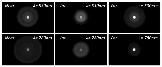 To acquire further insight into the differences in the optical performance of the IOLs between green and NIR illumination, Figure 4, Figure 5 and Figure 6 show the experimental pinhole images at the corresponding foci of the lenses, i.e., at the defocus position labelled as Far (F), Intermediate (Int) and Near (N) in Figure 3. The corresponding simulated images are shown in the Supplementary Figures S2–S4.