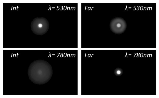 Two narrow-band light sources were used: a VIS (green) and a NIR light emitting diodes (LEDs) (Thorlabs GmbH, Munich, Germany) with emission centered at 530 nm and 780 nm, respectively. They both had a full-width half-maximum spectral bandwidth of 32 nm, which represents 6% (at 530 nm) and 4% (at 780 nm) of the central emission of the LEDs. Either the VIS or the NIR LED illuminated the test object located at the front focal plane of a collimator (200 mm focal length). The tests were a 200 µm pinhole for the assessment of the energy distribution among the foci planes (far and near), and a four-slit pattern for modulation transfer function (MTF) measurements [47].