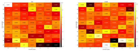 The results obtained with SVR and AdaBoost + SVR models using the parameters C = 50 and C = 100 at at a sample size of approximately 11,000 were as follows: Based on Table 2 and Table 3, it can be concluded that increasing the value of C further improved the achieved results. By breaking down the average error of the 25% of test data into correction factors with a 5 kg binning, we determined for the cases of C = 5 and C = 100 (see in Figure 2) that in the former case, the error was approximately h = 20 min, and in the latter case, the two worst results were approximately h = ±9.6 min, but the average errors were below 4 min.