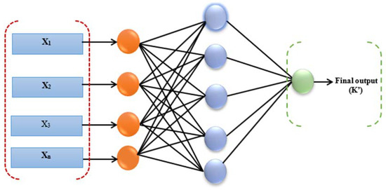 Additionally, FFNN-BP calls for training the network with trained input data, which is then processed within the network and transmitted to the output layer. If mistakes are made, they are passed around the system until the desired result is achieved. The FFNN-BP algorithm’s central idea is to minimize the network’s error so that it can fully understand the training data and make more precise predictions of the true value [22]. During operation, the initial weights are multiplied by the inputs, and the resulting value is transferred to the second layer, where it remains until it reaches the output layer, as shown in the following equation: