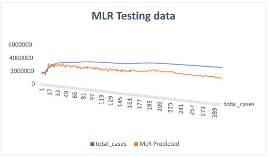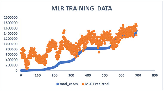 From the comparative predictive results of the models, as seen in Table 1, it can be clearly observed that the MLR model and the ANN model were capable of predicting COVID-19 cases. Therefore, the MLR and ANN models can act as reliable tools in predicting COVID-19 cases in the future. The results in Table 1 can be further discussed comparatively based on their corresponding determination coefficients (R2) using a clustered column and funnel chart (see Figure 7, Figure 8, Figure 9 and Figure 10). For R2 and R, the training results for ANN were 84% and 91%, while the results for MLR were 97% and 98% accuracy. Further, for the testing results, R2 and R for ANN were 94% and 97%, while the results for MLR were 97% and 98% accuracy. We can present and organize the findings from our predictive comparison in the following way: Regarding the prediction of COVID-19, MLR was superior to ANN, and this result is similar to the findings of [6,7,23,24,33,34]. Additionally, ref. [35] showed that the ANN model adopted to estimate and quantify the impact of the response measures imposed by many countries around the world to suppress the rapid spread of the COVID-19 pandemic on urban traffic mobility was capable of mapping the complex relationship between traffic flows and the response measures with a high level of accuracy and good performance. The predicted values were close to the observed ones, with a coefficient of determination (R2) of 0.9761. Similarly, a study by [36] adopted the ANN model to forecast the number of daily cases and deaths caused by COVID-19, in a generalized way, to fit different countries’ spread. The ANN model developed in this study showed 86% overall accuracy in predicting the mortality rate and 87% in predicting the number of cases, which makes it a reliable tool to predict the spread of the virus. Finally, a study by [37] predicted the daily COVID-19 cases in 10 African countries using machine learning models. The study concludes that ANN was among the models that offered accurate predictions that could assist governments and health organizations in making informed decisions and evaluating measures to prevent and control COVID-19.