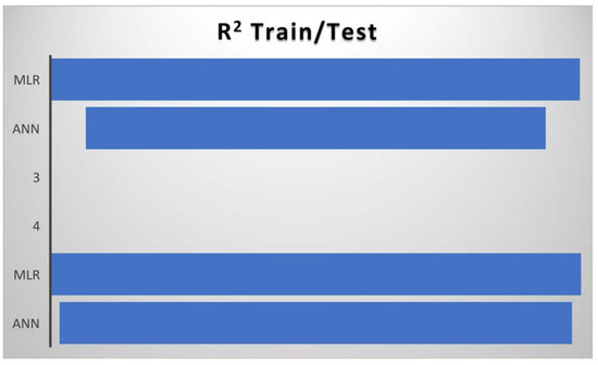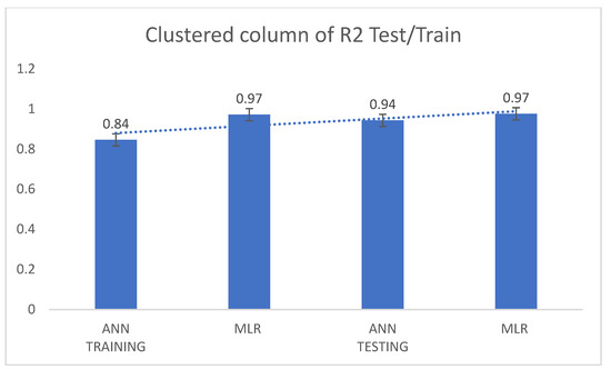 The MLR model was found to be a satisfactory and reliable tool based on the comparative outcome. Moreover, the corresponding determination coefficients (R2) in Table 1 demonstrate the statistical advantages of MLR over the ANN model, i.e., the data follows a linear pattern. Additionally, the ANN model produces negative values during the simulation, which may reduce its performance effectiveness. Figure 9 and Figure 10 show a clustered column and a funnel chart of the model’s performance showing how the data followed a linear pattern, with a scale of R2 from 0 to 1 for both the training and testing phases. For R2, the training result for ANN was 84% while the result for MLR was 97% accuracy, and for the testing result, the R2 for ANN was 0.94%, while the R2 for MLR was 0.97% accuracy.