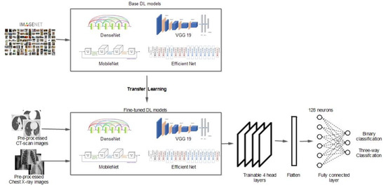 Transfer learning is an inevitable step for networks with sparse data (a few hundred or thousand images). Transfer learning is applied to a vast, pretrained network of millions of images. There are two main techniques for applying transfer learning: feature extraction and fine-tuning. For the first technique, only some of the newly added layers are updated and improved during the training phase. In contrast, for the second technique, the weights for all layers are updated, optimized, and customized for the new classification problem. In general, fine-tuning is more effective than the feature extraction technique. Fine-tuning DL models (EfficientB0, VGG-19, DenseNet121, MobileNetV2, etc.) requires extensive resources and time. Initially, the convolution layers learn low-level features and, as the network grows, mid/high-level features are learned. With fine-tuning, these trained low-level features are retained, while the high-level features are trained for new classification problems. In this study, five residual blocks were used: the input, two convolution layers, a max-pooling layer, and an output layer. Subsequently, fine-tuning transfer learning was employed for the first four head layers of the network. The trainable parameters were adjusted along with the supplemented soft-max activation function, which consisted of two or three output neurons relating to binary or three-way classification. Algorithm 1 summarizes the working steps for our DL model.