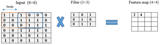 An example of a convolution operation with a resulting 4 × 4 feature map, filter size of 3, and stride of 2.