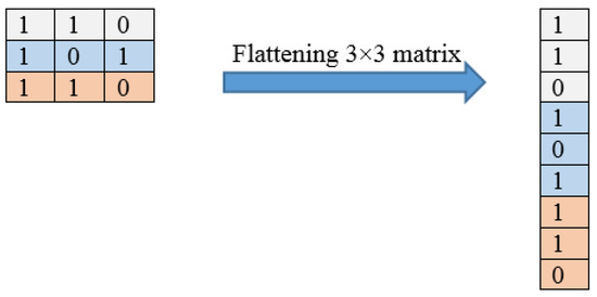Figure 3 illustrates an example of the convolution operation with a 6 × 6 matrix using a stride of 2 and a 3 × 3 filter. The stride value defines the moving filter window of the input matrix. The pooling layer, which comes after the convolutional layer, is responsible for reducing the network computational loss; it is a fully connected layer where all neurons receive their inputs from the flattened form of the previous convolutional layer, as illustrated in Figure 4. An example of a flattening operation is depicted in Figure 5. In our study, some of the popular pooling functions considered were the average, L2 norm, minimum, and maximum functions. In addition, the output layer depends on the number of categories required to train the DL models. In our experiments, two different datasets were utilized: the CT scan dataset, which has a binary classification of COVID and non-COVID; and the chest X-ray dataset, which has a triple classification of COVID-19, normal, and pneumonia classes.