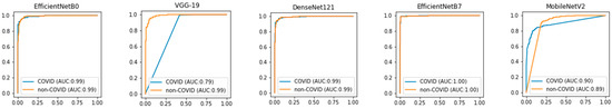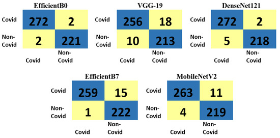 Table 6 presents the detailed results for the two categories (COVID-19 vs. non-COVID) obtained with the five mentioned DL models with regard to precision, sensitivity, specificity, F1-score, and accuracy. As can be observed in the table, all models achieved accuracy greater than 95%. Regarding the COVID-19 class, the highest values are underlined and marked in red, while the non-COVID class is underlined and marked in green. For the COVID-19 category, the EfficientB0 model was the best in terms of precision and F1-score. However, EfficientB7 achieved the highest sensitivity and specificity, while MobileNetV2 achieved the highest accuracy. Regarding the non-COVID class, the EfficientB0 model was also the best in terms of precision and F1-score. The MobileNetV2 model achieved the highest sensitivity, specificity, and accuracy. For more details, see Appendix A.
