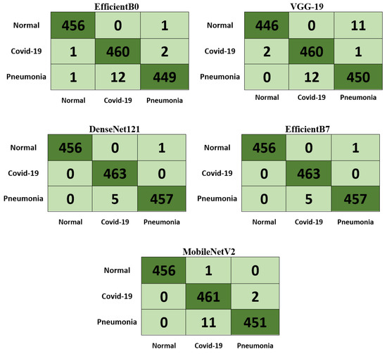 Figure 8 illustrates the 80–20% confusion matrixes for the five models with the CT scan dataset, showing support of 274 and 223 for the COVID-19 and normal classes, respectively. The best model, MobileNetV2, misclassified only 2 out of 274 of the COVID-19 images as normal. Moreover, 2 out of 223 of the normal images were also misclassified. In contrast, the worst model, VGG-19, misclassified ten images in the COVID-19 class as normal. Figure 9 illustrates the 80–20% confusion matrixes for the five models with the chest X-ray dataset, showing support of 457, 463, and 462 for the normal, COVID-19, and viral pneumonia classes, respectively. As can be observed, DenseNet121 was the best model because it classified all COVID-19 images (463 images) accurately. Classifying COVID-19 images accurately with no errors is a remarkable result, as the control is spread among individuals. Moreover, only one normal image was misclassified as pneumonia, and five pneumonia images were misclassified as COVID-19. However, this is less severe than misclassifying COVID-19 images. It can be observed that the DenseNet121 model was not confused with respect to COVID-19 images.