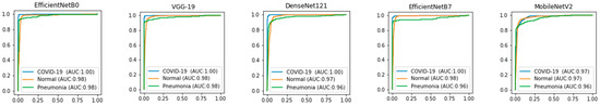 Table 7 presents the detailed results for the three-category (COVID-19 vs. normal vs. viral pneumonia) dataset. The highest values for the COVID-19 class are underlined and marked in red, the highest values for the normal class are underlined and marked in green, and, finally, the highest values for the viral pneumonia class are underlined and marked in blue. As can be observed in the table, for the COVID-19 category, DenseNet121 achieved the highest precision, sensitivity, specificity, F1-score, and accuracy with 98.93%, 99.46%, 100%, 99.45%, and 99.63%, respectively. DenseNet121 also achieved the highest values for the normal class for all metrics with 100%, 99.89%, 99.78%, 100%, and 99.92%, respectively. Furthermore, for the viral pneumonia class, it achieved the best results in terms of precision, specificity, and accuracy with 99.78%, 99.89%, and 99.56%, respectively. However, MobileNetV2 surpassed DenseNet121 in terms of the F1-score and sensitivity, achieving 99.35% and 98.91%, respectively. For more details, see Appendix A.