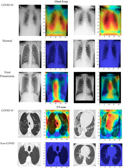 Grad-CAM sample results for COVID-19, normal, and viral pneumonia classes in the chest X-ray dataset and COVID-19 and non-COVID classes in the CT scan dataset.