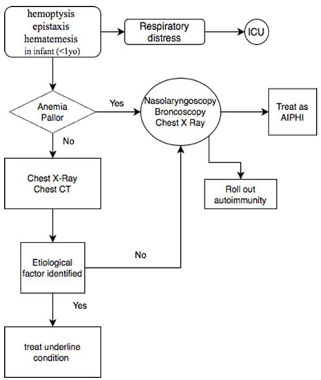 - Chavez, H.; Gomara, R.E.; Plouff, R. A 4-week-old infant with idiopathic pulmonary hemorrhage. Pediatr. Emerg. Care 2000, 16, 42–44. [Google Scholar] [CrossRef]