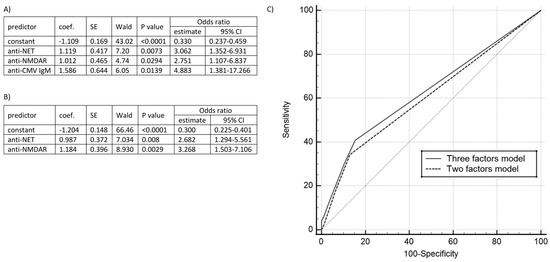 The logistic regression models. (A) The three-factor model characteristics (PCC = 70.71%; SP = 84.66%; SE = 40.79%). (B) The two-factor model characteristics (PCC = 71.97%; SP = 86.73%; SE = 34.09%). (C) The models’ comparison. Abbreviations: CMV—cytomegalovirus, NET—neuroendothelium, NMDAr—N-methyl-D-aspartate receptor, PCC—a percentage of consonants correct; SE—sensitivity; SP—specificity.