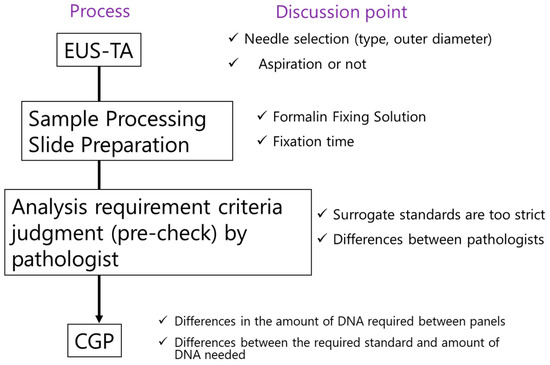 Process from EUS-TA to CGP analysis and discussion points. CGP: comprehensive genome profile; EUS-TA: endoscopic ultrasound-guided tissue acquisition.