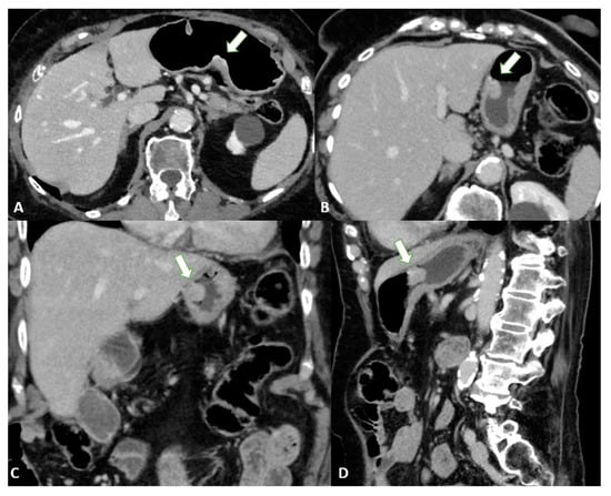 The administration of intravenous contrast medium is mandatory for the examination of the gastric walls. CT images should be acquired at least in the unenhanced phase and approximately 70 s after injection, the optimal time for GC enhancement. To assess the presence of vascular variants of the stomach, arterial phase imaging can be added [26]. Finally, postprocessed reconstructions (multiplanar reconstructions—MPR) in the coronal and sagittal planes can provide a better assessment of the tumor location and depth.