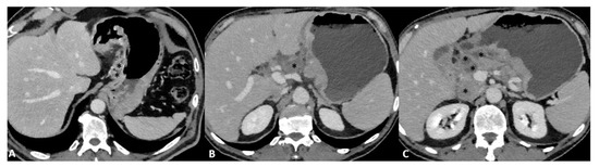 Figure 8. Axial 2D images in the portal venous phase show different pathological node locations (black asterisks): (A) pathological lymph nodes in the lesser curvature of the stomach; (B) pathological lymph nodes of the lesser curvature and the celiac artery; (C) pathological lymph nodes of the pancreatic head and para-aortic region. The lymph nodes in the images present an inhomogeneous contrast enhancement with central hypodensity due to the presence of necrotic components inside.