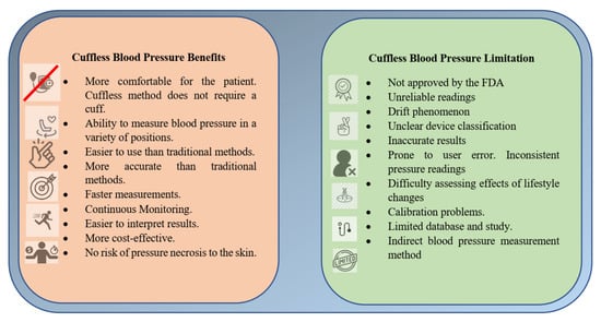 CBP measurement methods have several advantages over traditional cuff-based methods. First, they are noninvasive and thus do not require using an inflatable cuff with the associated discomfort. Second, they are more accurate and provide more detailed information about blood pressure. Third, they are faster since they do not require the time-consuming process of inflating and deflating the cuff. Finally, they are less prone to errors due to incorrect cuff placement and other user errors. Figure 1 shows cuffless blood pressure benefits and limitations [9,10,11].