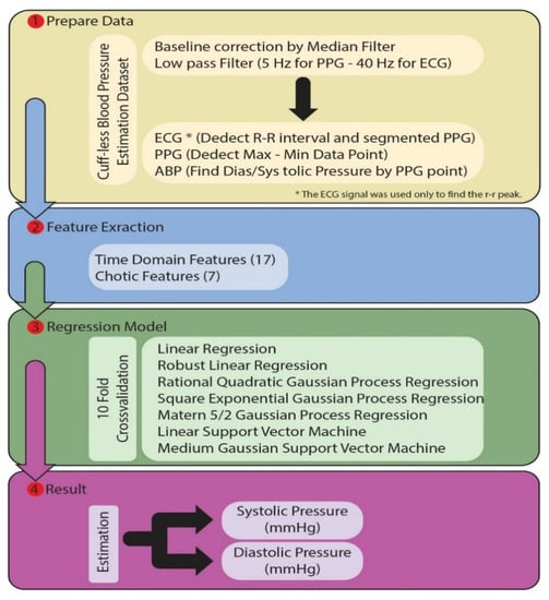 - El-Hajj, C.; Kyriacou, P.A. A review of machine learning techniques in photoplethysmography for the non-invasive cuff-less measurement of blood pressure. Biomed. Signal Process. Control 2020, 58, 101870. [Google Scholar] [CrossRef]