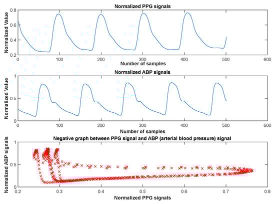 There was a negative correlation between the PPG and atrial blood pressure signals (ABP). El-Hajj et al. described and proved the correlation between the PPG and BP signals in detail [6,13,23]. Based on this information, we have performed experiments to show the relationship between the PPG signals and BP signals in our paper. As a result of the statistical studies, it was determined that there is a correlation coefficient of “−0.279” between the PPG signal and the ABP signal. Figure 4 shows the normalized PPG signals, the normalized ABP signals, and the negative graph between the PPG signals and ABP signals. Therefore, in this paper, we have used the PPG signals to predict the SBP and DBP values using machine learning methods with statistical results from the given figures.