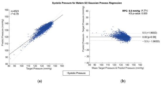 Predicted SBP for the Matérn 5/2 Gaussian process regression method: (a) the plot of the correlation and (b) the Bland–Altman Plot.