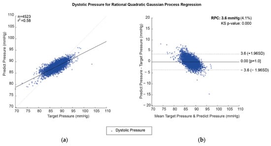 Predicted DBP for the rational quadratic Gaussian process regression method: (a) correlation plot and (b) the Bland–Altman Plot.