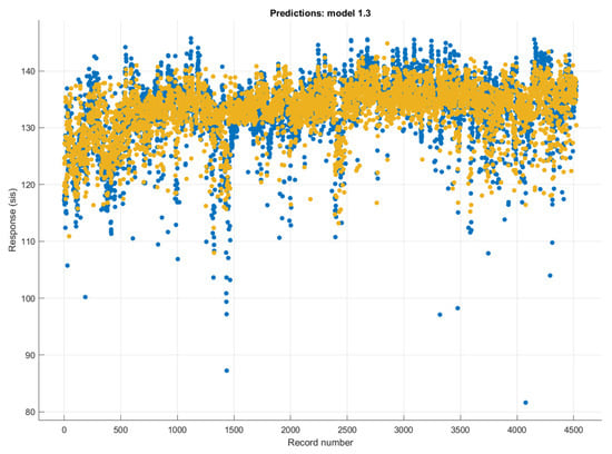 The target and predicted values in the prediction of SBP values using the Matérn 5/2 Gaussian process regression method (blue mark: actual SBP values; orange mark: the predicted SBP values).