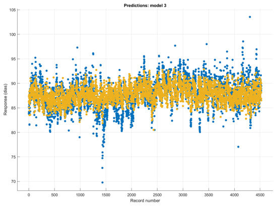 The target and predicted values in the prediction of DBP values using the rational quadratic Gaussian process regression method (blue mark: actual DBP values; orange mark: the predicted DBP values).