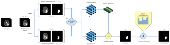 A pipeline of the proposed prototypical one-shot segmentation model to separate brain tumor regions.