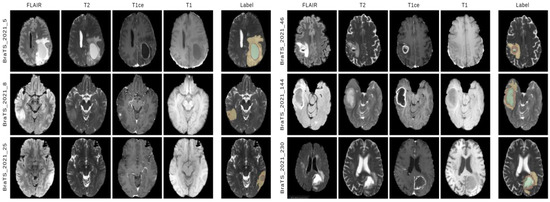 Illustration of six samples of multi-parametric MRI images (slice containing tumor region) from the BraTS 2021 dataset depicting Flair, T2, T1ce, T1 modalities, and label. The yellow, green, and red regions on the label indicate the tumor regions of different levels.