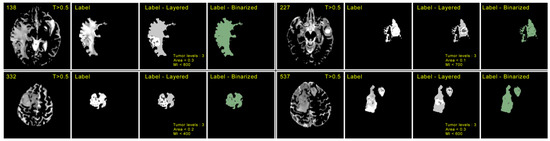 Demonstration of the procedure for determining the portion of the tumor in each slice. Here, the first column of each image contains the serial number according to the BraTS dataset and the corresponding random slice with an intensity threshold > 0.5. The second column contains the corresponding label of each scan. The third column depicts the layered structure of labels highlighting tumor levels, area, and mean intensities (MI). The fourth column contains the binarized form of label data.