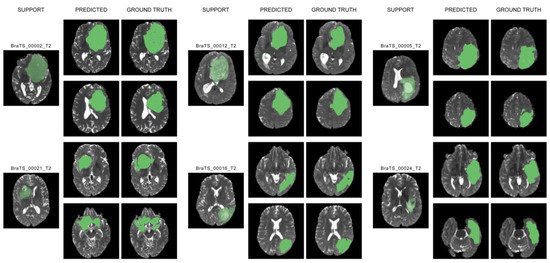 The similarity between ground truth and predicted segmentation is assessed by two major comparison metrics. We used the mean and maximum dice score and mean and maximum intersection over union (IOU) score to assess our findings. The maximum metric of these scores is considered in order to quantify the extent to which our proposed one-shot segmentation proves to be effective. The performance metrics with 1-shot 1-way show a high average dice core of 83% and an average IOU of 80.9% compared to the other increasing number of samples carried out in the conventional studies. Model predictions along with their ground truths are depicted in Figure 4.