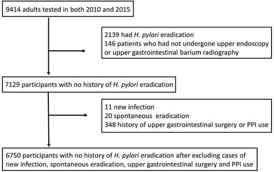 A total of 9414 adults met the inclusion criteria. Of these, 2139 participants were excluded because they had a history of H. pylori eradication therapy. Of the remaining 7275 participants without a history of H. pylori eradication, 146 participants who had not undergone EGD or upper gastrointestinal barium radiography were excluded. Therefore, the remaining 7129 participants without a history of H. pylori eradication were analyzed. Subsequently, 6750 participants were analyzed after excluding cases of new H. pylori infections, spontaneous eradication, history of upper gastrointestinal tract surgery, and PPI use (Figure 1).