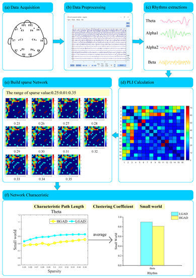 As shown in Figure 1, data preprocessing was done after the data collection was completed. Firstly, de-artifacting of EEG data was executed by fast-ICA, removing artifacts such as eyes blinking, ECG, electromyography, and so on. Secondly, the EEG data were down-sampled from 250 Hz to 125 Hz. Thirdly, high- and low-pass signals below 4 HZ and above 30 HZ were filtered out by using the fourth-order Butterworth bandpass filter. Then, 4 s of continuous EEG data with 50% overlap were applied for EEG segmentation to obtain 6587 LGAD data samples and 5012 HGAD data samples. Finally, the same bandpass filter was used to separate the EEG rhythms of theta (4–8 Hz), alpha1 (8–10 Hz), alpha2 (10–13 Hz), and beta (13–30 Hz) of each EEG sample.