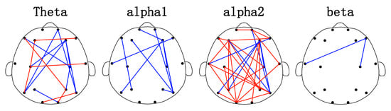 Figure 2 shows the analysis results of brain FC. The edge (the connection between two channels) represents the connection between two electrodes. Statistical differences in PLI values were verified between the HGAD and LGAD groups. In Figure 2, the blue line represents that LGAD has a higher PLI value on the edge, and the red line represents that HGAD has a higher PLI value on the edge. The topological distribution of brain networks suggests that FC is mainly associated with the frontal brain regions and are distributed between the frontal brain regions and other regions. Specifically, 73% of FC is related to the frontal area, and this ratio is 10/16, 8/9, 21/29, and 2/2 for the theta, alpha1, alpha2, and beta rhythms, respectively. PLI values of HGAD were significantly enhanced in the alpha2 rhythm (accounting for 75.86% (22/29) of the total connectivity), and mainly decreased in the theta and alpha1 rhythms.