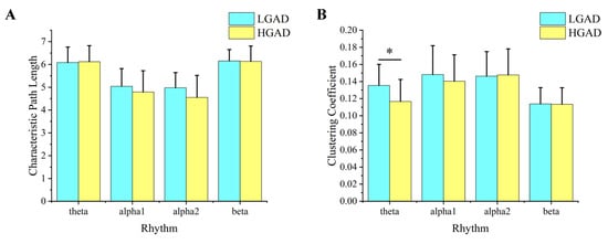 The results of network features for all EEG rhythms between LGAD and HGAD. (A) Characteristic path length. (B) Clustering coefficient. The column represents the size of the value, and * represents the statistical difference between the two groups of characteristic values at this position (p < 0.05).