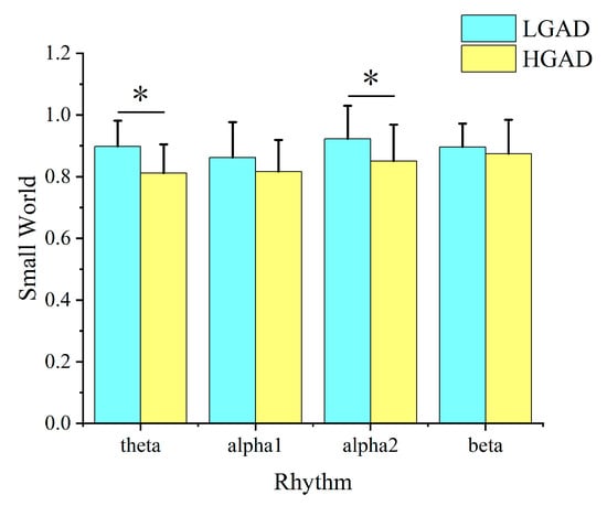 Small-world attribute analysis results of LGAD and HGAD in theta, alpha1, alpha2, and beta rhythms. Among them, the column represents the size of the value, and * represents the statistical difference between the two groups of characteristic values at this location (p < 0.05).