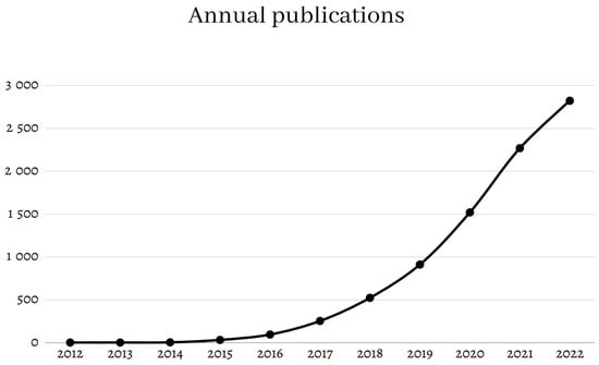 Evolution of the number of annual publications related to radiomics over the past 10 years. Data obtained from PubMed with the keyword “radiomics” in February 2023.
