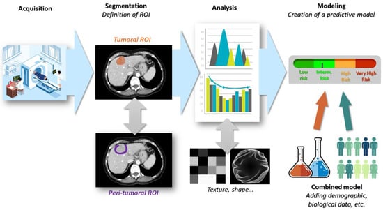 Process of a radiomics study. After image acquisition, the ROI (Region Of Interest) is segmented and features are extracted and analyzed to create the model, which can be combined with biological, demographic data, etc.