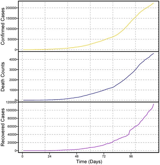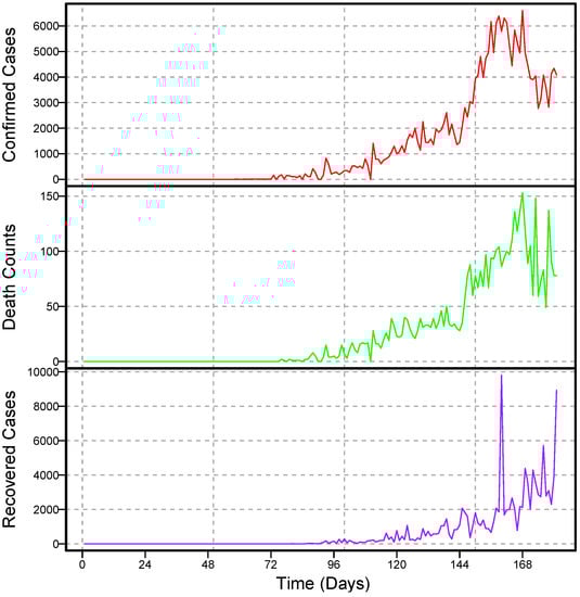 The study used daily data from confirmed COVID-19 cases, deaths, and recovered cases from Pakistan. The dataset was obtained from the World Health Organization; each series ranges from 10 March 2020 to 3 July 2020. The descriptive statistics of the considered datasets are given in Table 2. For practical and rational modeling through time series models, at least 30 observations were required []. To do this, approximately 116 data points from each series were considered. The complete dataset covers 116 days, of which 10 March 2020 to 19 May 2020 (71 days) were used for model training, and 21 May to 3 July 2020 (45 days) were used for one-day-ahead post sample (testing) predictions.