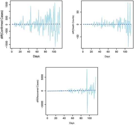 For modeling, one of the most important things to assume about time series data is that it is stationary. A stationary process is one in which the mean, the variance, and the structure of the autocorrelation do not change over time. If the underlying series is nonstationary, it should be converted to stationary. In the literature, different techniques are used to achieve stationarity, for example, taking the natural log and differencing the series or box-cox transformation []. In this work, the daily COVID-19 confirmed cases, deaths, and recovery time series are plotted in Figure 1 for daily and Figure 2 for cumulative cases. As seen, all three time series have an upward increasing linear trend, which shows that the series are non-stationary, hence the need to make them stationary using the differencing method. In addition, to check the unit root issue of the aforementioned series statistically, we apply the augmented Dickey–Fuller test. The results are listed in Table 1, which suggests that all three series are nonstationary at the level. However, taking the first-order difference into account, the series turned out to be stationary. The first order differencing series of daily confirmed cases, deaths, and recovered cases is depicted in Figure 3, which ensures stationarity.