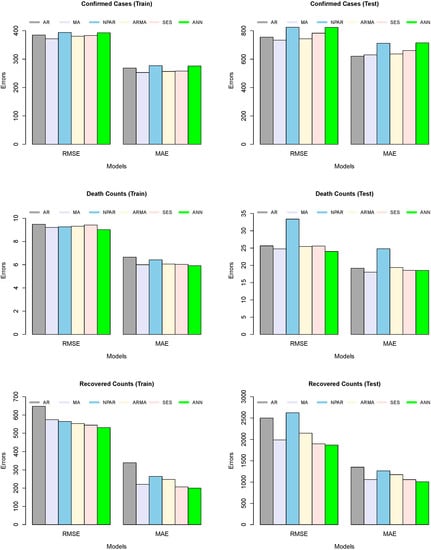 We used two accuracy measures (MAE and RMSE) to figure out which model for each series is the best. The results of these accuracy measures are shown in Table 3 and Table 4. Table 3 shows the numerical description of the trained model’s accuracy mean errors for the all-considered model, such as five time series models and a machine learning model. On the other hand, the table presented a numerical description of the tested model’s accuracy and mean errors for all considered models. From the output of both Table 3 and Table 4, we can observe that the MA model produced low forecast errors, in contrast to all other competitors for confirmed predictions. The RMSE and MAE values for the MA model are 733.92 and 629.95, respectively, for confirmed cases. However, the ARMA model remains a good competitor. In the case of predicted death counts and recovered patients due to COVID-19, the ANN algorithm shows better results than the rest of the models, while the MA and SES models are the second- and third-best models, respectively. In addition, a graphical analysis of the RMSE and MAE values for confirmed cases, death counts, and recovered patients is plotted in Figure 4. However, Figure 4 (left column) shows the graphical representation of the trained model’s accuracy mean errors for all considered models. On the other side, Figure 4 (right column) shows the graphical representation of the test model’s accuracy mean errors for all considered models. The superiority of the MA (confirmed cases) and ANN (death counts and recovered patients) models can be seen in both training and testing exercises.