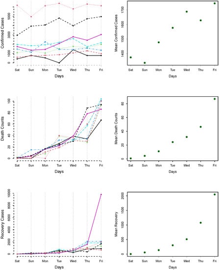 The day-specific confirmed cases, deaths, and recovered counts are plotted in Figure 6 for 21 March to 19 June 2020. Figure 6 (left column) shows that there is variation among the different weeks, while in Figure 6 (right-column), the mean of days are plotted for confirmed cases, deaths, and recovered cases. We can see an increasing pattern from Saturday to Friday, which shows the effect of working and non-working days.
