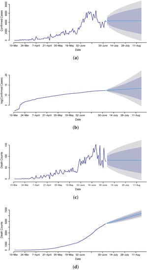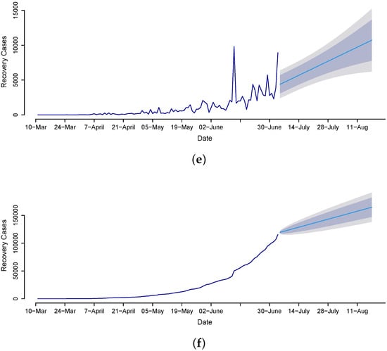 Once the best models are assessed through the out-of-sample mean errors (RMSE, MAE), a statistical test (DM test), and graphical analysis, we proceed to the future forecasting of confirmed cases, death counts, and recovered cases. Therefore, we implement the MA model for confirmed cases and the ANN model for the death count and recovered cases to forecast from 4 July to 14 August 2020, for the daily and cumulative number of cases. The forecasted values are presented in Figure 7, clearly revealing that death counts and recovered cases are monotonically increasing while confirmed cases are not. The confirmed cases on 14 August 2020 are expected to be 7325, and the cumulative is 413,639. The death counts during late August are expected to be 121, and the cumulative counts are 9279. The recovered cases are 10,730, and the cumulative count is 455,661. Overall, the results suggest that the trend in confirmed cases gradually decreased over time, which is the outcome of the earlier steps that the government imposed, such as canceling conferences to disrupt supply chains; imposing travel restrictions; closing borders; canceling flights; closing workplaces; closing shopping malls, schools, colleges, and universities; and raising awareness through different TV programs, commercials, and advertisements, as well as having everyone use face masks and sanitizers.