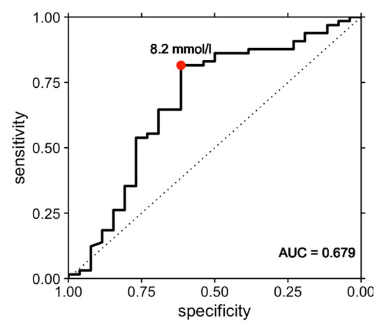 The resulting ROC curve had an area under the curve of 0.679 (95% confidence interval, 0.544–0.814, Figure 1). The optimal threshold value of 8.2 mmol/L as determined by Youden’s J index was associated with a sensitivity of 81.5% and a specificity of 61.5%. The associated positive predictive value of a CSF lactate threshold value of 8.2 mmol/L for sepsis was 84.1%, while the negative predictive value was 57.1%.