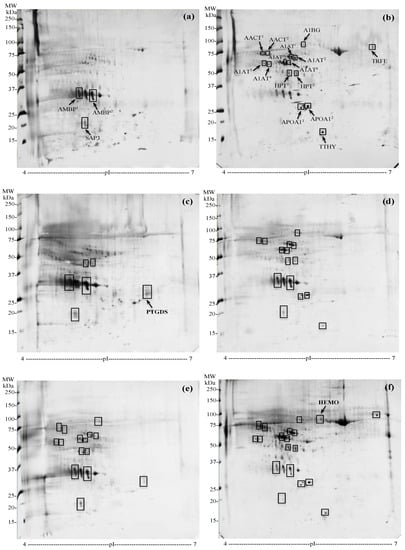 Representative urinary 2D gels; (a) PCa group (all PCa patients with and without inflammation); (b) BPH group (all BPH patients with and without inflammation); (c) noI-PCa group (PCa patients without inflammation); (d) noI-BPH group (BPH patients without inflammation); (e) I-PCa group (PCa patients with inflammation); (f) I-BPH group (BPH patients with inflammation). The significantly different spots are enclosed in rectangles, and in panels (a–c,f) are included the protein entry names, corresponding to those reported in Table 3. AMBP, Alpha-1-microglobulin; SAP3, Ganglioside GM2 activator; AACT, Alpha-1-antichymotrypsin; A1BG, Alpha-1-beta-glicoprotein; TRFE, Serotransferrin; A1AT, Alpha-1-antitrypsin; HPT, Haptoglobin; APOA1, Apolipoprotein A1; TTHY, Transthyretin; PTGDS, Prostaglandin-H2 D-isomerase; HEMO, Hemopexin.